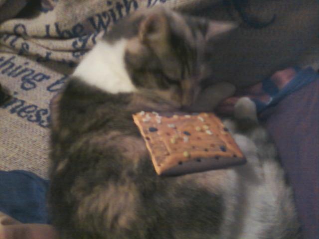 It doesn’t pass the real food test. What’s the real food test you ask? See if the cat will eat it. The cat eats chicken, fish, cream. Real food. She wont touch anything fried. Nor will she even take a nibble of any marshmallow cereals. Which, sadly, looks a lot like her food. Anyways, we gave the cat a Halloween Pop Tart to try and here is what happened.