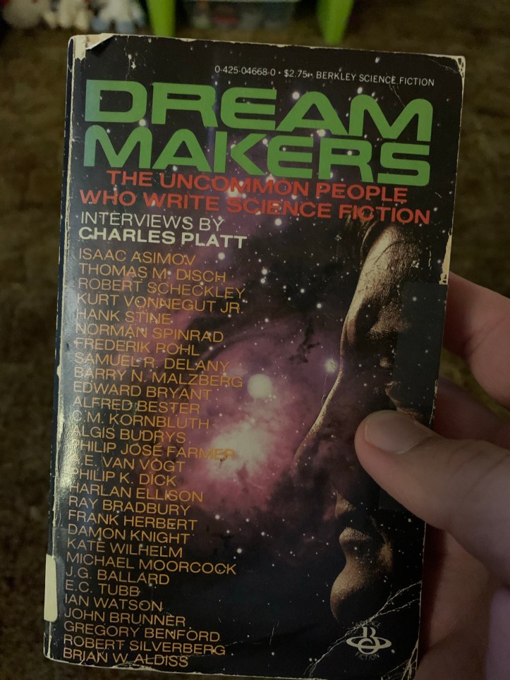 Let’s dig into the forgotten stacks of the library and pull out this tome. Dream Makers from 1982 is a collection of interviews Charles Platt conducted with sci-fi writers. As expected, Asimov and Bradbury and the like show up. I read about 10 pages of the book because right in the middle is a bit on Harlan Ellison. There’s everything one would come to expect from Ellison within. Self deprecating puts over his own work. Trashes some people, builds up others. Throws some personal history and personality quirks within. But it was one quote that really got me.