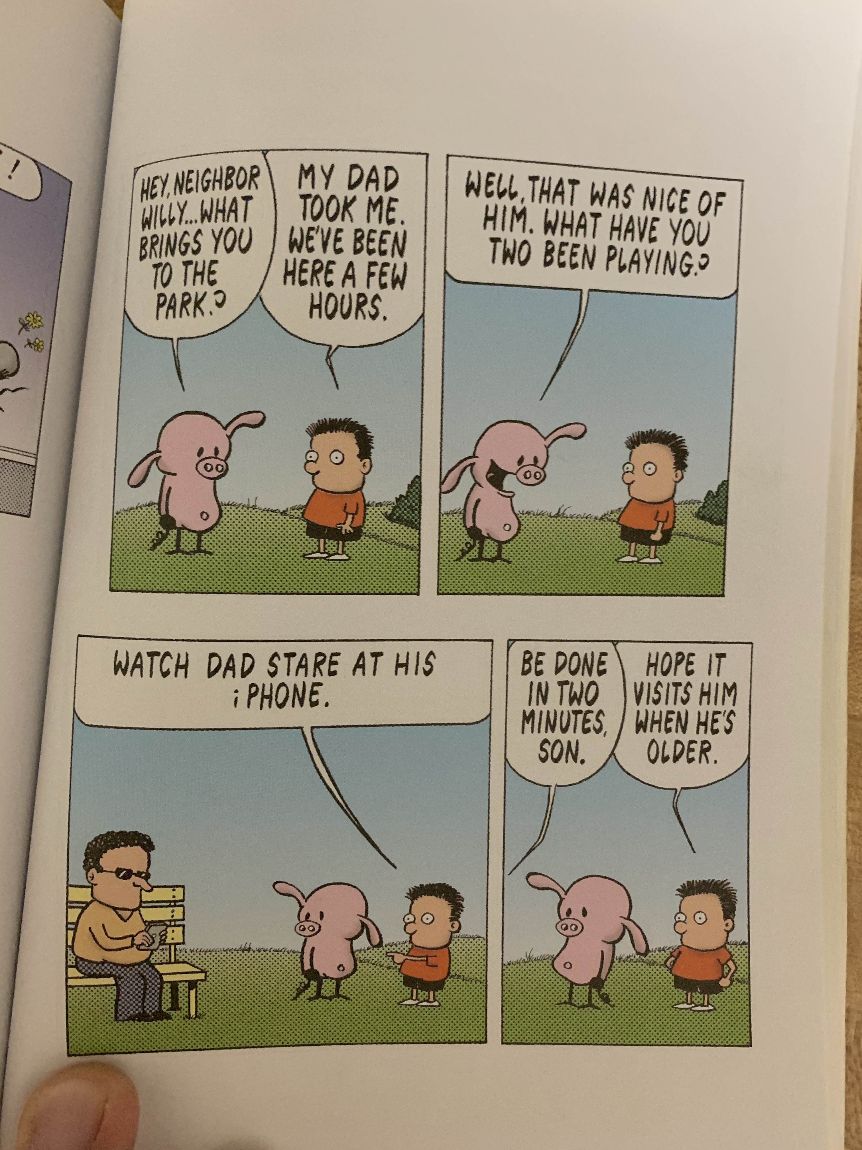 But to go back before going forward on this book review. I had graduated college and was living in California for a summer with my then girlfriend. I couldn’t see the forest for the redwoods at the time, but the relationship was bad. We had to travel with a box of therapy stuffed animals and this made perfect sense to me at the time. My days were overly structured, from what I watched to when I worked to what I was allowed to do, down to how much toilet paper I used. Most people would rebel against such an environment by treating themselves to something in order to escape. But my finances were controlled as well. I needed something as a support, an outlet, and also free. Thank you to the break room at my then employer for subscribing to the local paper. Inside the comics page was a deceptively simple new to me strip called Pearls Before Swine.