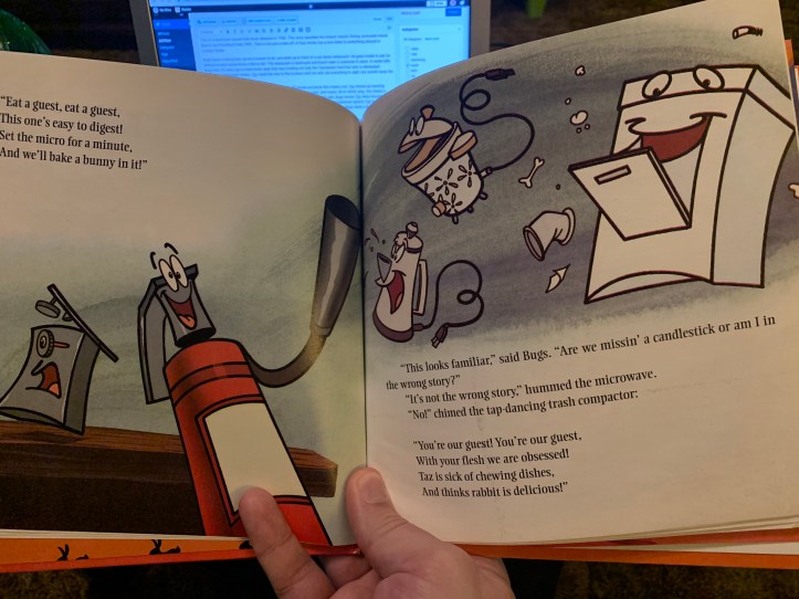 What could have been a nothing children’s book becomes a classic of Warner Bros. animation. How would any of us describe Taz spinning into a room? Impossible. Yet here, “he wheezed and burpled and whirled himself into a fury.” I want to read that aloud. To my kid, to your kid, to the world. But not in his voice. No, that has to be saved for later when Taz first sees Bugs Bunny and reacts. “Ughoooeegh! Gleesptzgabelch-raa-baat?!” Absolute gibberish yet I’m well aware how to pronounce every letter.
