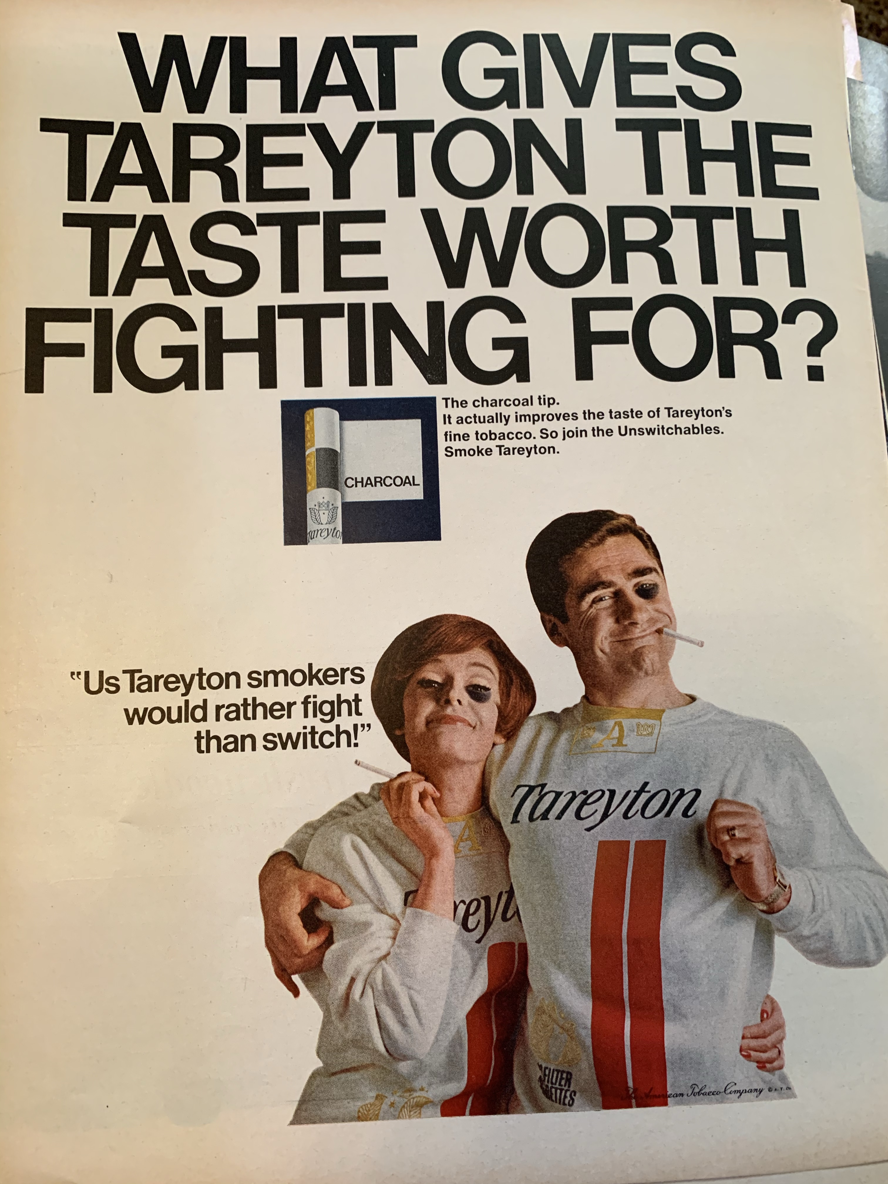 This magazine advertisement is from the mid to late 1960’s. These loyal cigarette smokers would rather fight you than smoke anything else. Or not smoke at all. There’s also a “common man” approach because the slogan is grammatically incorrect. “Us Tareyton smokers” is not proper English. By no means am I saying everything I’ve ever written is perfect, but I’m also not getting paid a lot of money along with the entire advertising team to come up with this.