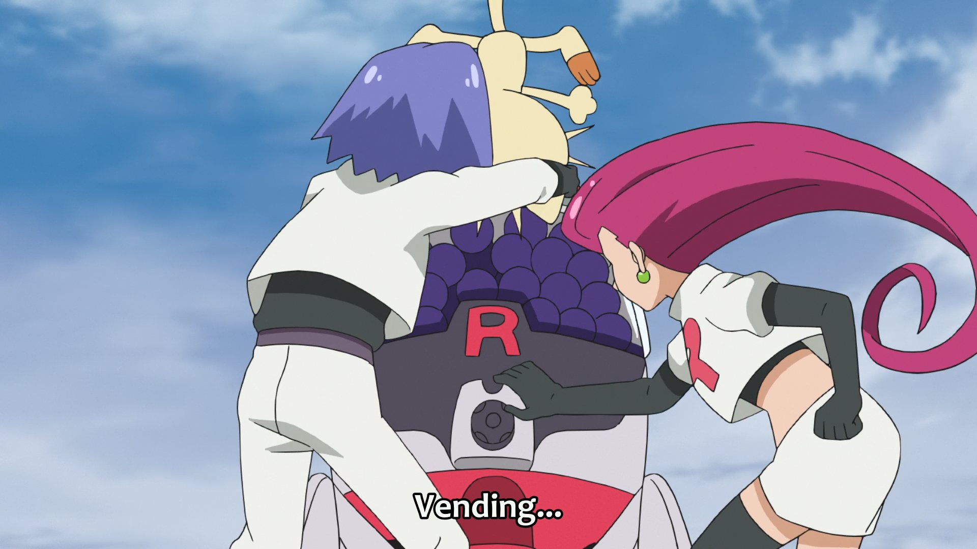 In this latest series Team Rocket coincidentally is going after the same Pokemon Ash and Goh are researching. Jessie and James now call both heroes “twerps” and battle against them with the always faithful Meowth and the returning Wobbuffet. This time though they have special Pokemon drop shipped to them. This is my favorite part of the new series. A Pelipper flies above and drops down a Gashapon machine. A gashapon is the name for a Japanese capsule toy coin operated machine. Put the quarter in and a plastic ball drops down with a cheap toy inside. Gashapon is a onomatopoeic word created by the sounds the machine makes as the toy is chosen and comes out. Team Rocket receives an entire machine when needed and stick Meowth’s head – which includes a coin – inside the machine then opens up their capsule balls to reveal which Pokemon are joining the battle. I am beyond entertained every time I see this happen on the show. Whether one day I get to go to Japan or even a Japan-town like in San Francisco I will be looking for one of these machines. You know they exist now. That is leaving money on the table otherwise.
