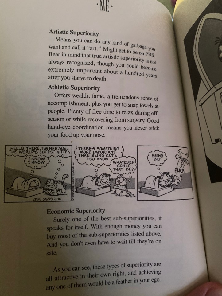 This how to guide written by America’s favorite fat orange cartoon cat (and more on that soon) came out in 1990. A self help book to teach the reader how to be as conceited as the lasagna loving Monday hating cat himself. Every bit of the book is tongue in cheek but also an accurate depiction of some people. Your Gordon Gecko “greed is good” types. Give me money, everyone else is on their own. Even the first page of the book puts this point across.
