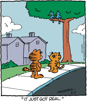That said, these two cats are very different. Heathcliff has “owners” but is really more of a street cat. He wanders the neighborhood, steals things, has fights, loves female cats. He rules the neighborhood as the toughest animal on the block. It honestly reminds me of a cat that patrols our street. On the other hand, Garfield is content being a house cat. He might wander as far as the fence, but the majority of his tales take place within Jon’s property. Even trips to the vet, which are frequent, is not of his own free will. He controls his comfortable environment and rules over Jon, Odie, Nermal, and random mice or spiders. Most of his trips outdoors include anxiety over being taken away from his familiar surroundings. He is no longer the alpha feline that he can be at home.