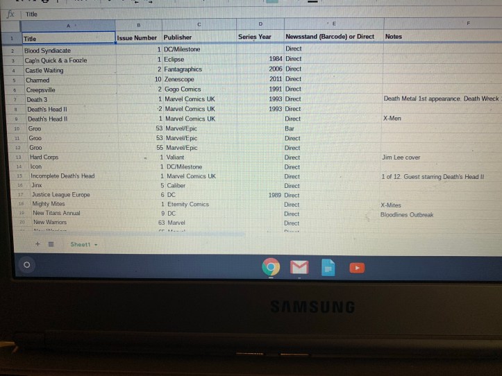 Speaking of choice, I have no idea if I’m doing this right or not. I chose to put this list together using a Google Sheets doc. It is connected to the two emails I use the most so I could access this from my phone or other locations. My goal is to have this set up in a clear manner so the next time I look through back issue boxes I can take out my phone and know at a glance if I have or need that comic.