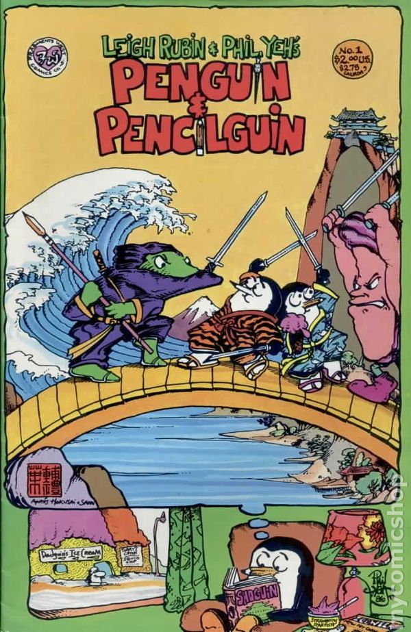 Penguin and Pencilguin came out in 1987 from Fragments West. Six issues came out that year with a seventh in 1991 and an eighth and final in 1994. The creators, Leigh Rubin and Phil Yeh, formed Cartoonists Across America to stop illiteracy through the use of comics and cartoons. There are many many comic book readers who will vow they learned how to read thanks to comics. Using animals in human situations lightens up the mood and can assist a struggling reader learn. The animals allow the reader to not take everything too seriously.