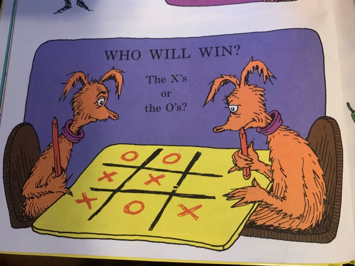Now, these are kids books and I have to keep that in mind. Because I found much of this book to be annoying. Two Seuss creatures playing Tic Tac Toe and who will win – the X’s or O’s. Well, that depends on who’s turn is next. The next move will win but is the next move from the player who is X or the player who is O? I can’t answer a question with such variables!
