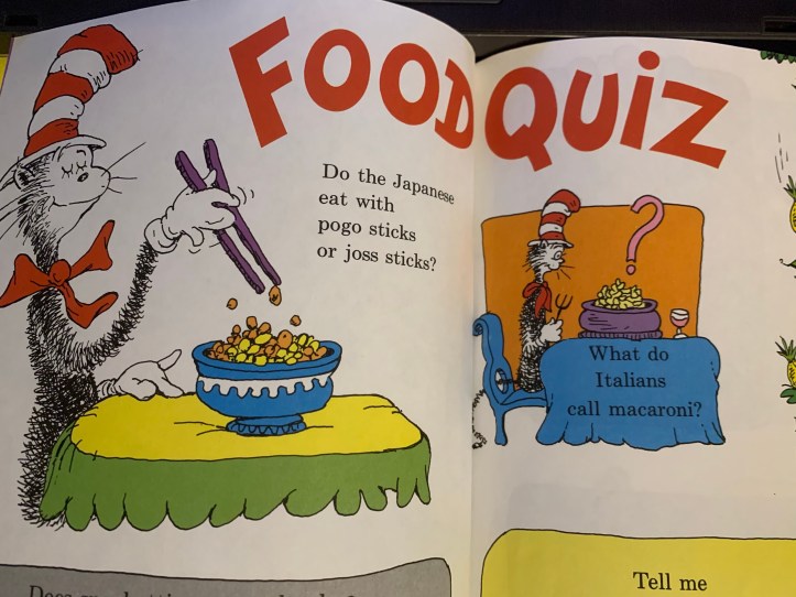 The second of the six pulled Dr Seuss books to be discussed on this site. Originally released in 1976 this book features the Cat in the Hat taking the readers through a series of questions, puzzles, and riddles. The point is to score higher than Ziggy and Zizzy Zozzfozzel who got a perfect score. All wrong.