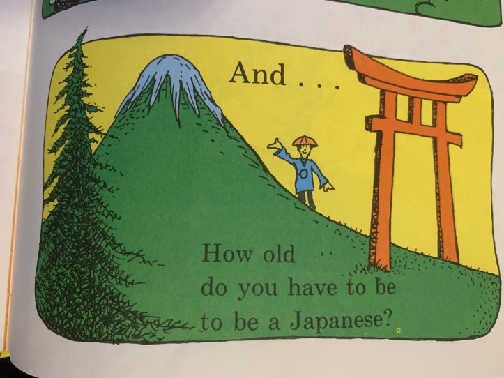 But that’s not the only one in the book. “How old do you have to be to be a Japanese?” Nothing in this book is going for a Seuss rhyme. Nor a certain amount of syllables. This could have said “be Japanese” and the earlier one “Japanese people”. Actually the earlier one could probably go. Purposely using the wrong names for something is a way to take any power away from them. Just witness a man hitting on a woman for example. “What’s your boyfriend’s name? Timmy?” Tommy. “Whatever. Like it matters.” Completely disrespects Timmy. Or Tommy. See, it works! Also, that’s a whole lot of yellow in that picture. Coincidence? Sure. Could be. But these books go through many people before reaching the public. Some of whom are employed to edit for content.