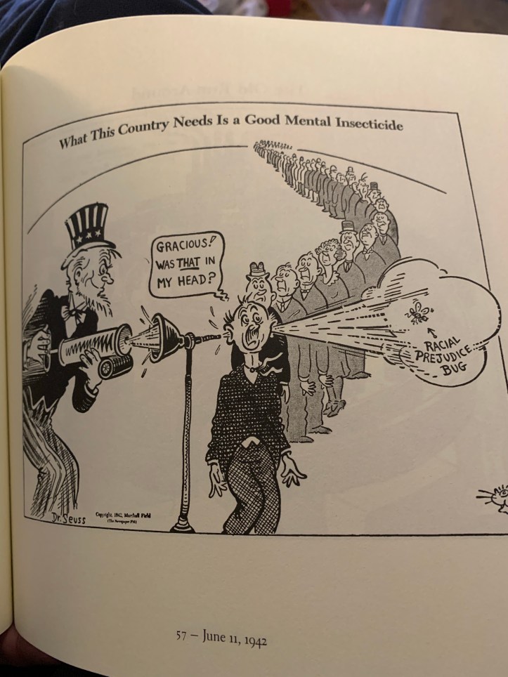 The book isn’t complete, not even complete for all of Seuss’s political cartoons, but it provides a better understanding of the man and his work than a children’s book can. Or should have to. An academic approach to these cartoons, and again to the six other books as well, is the best way to keep the works in print but also provide context and explanation for any questionable images.