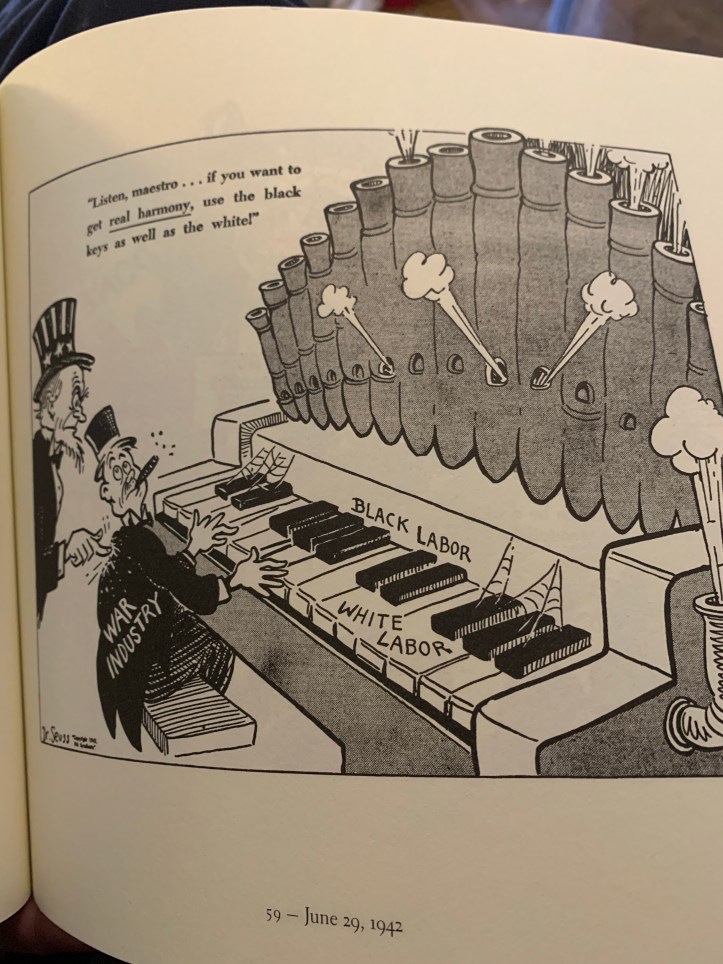 Another surprise in this book is Seuss’s thoughts against racism and racist policies. He believes in unity. He believes racist thoughts need to be removed from our brains. He is all for treating all Black men, women, and children as equals. The piano key cartoon is especially powerful.