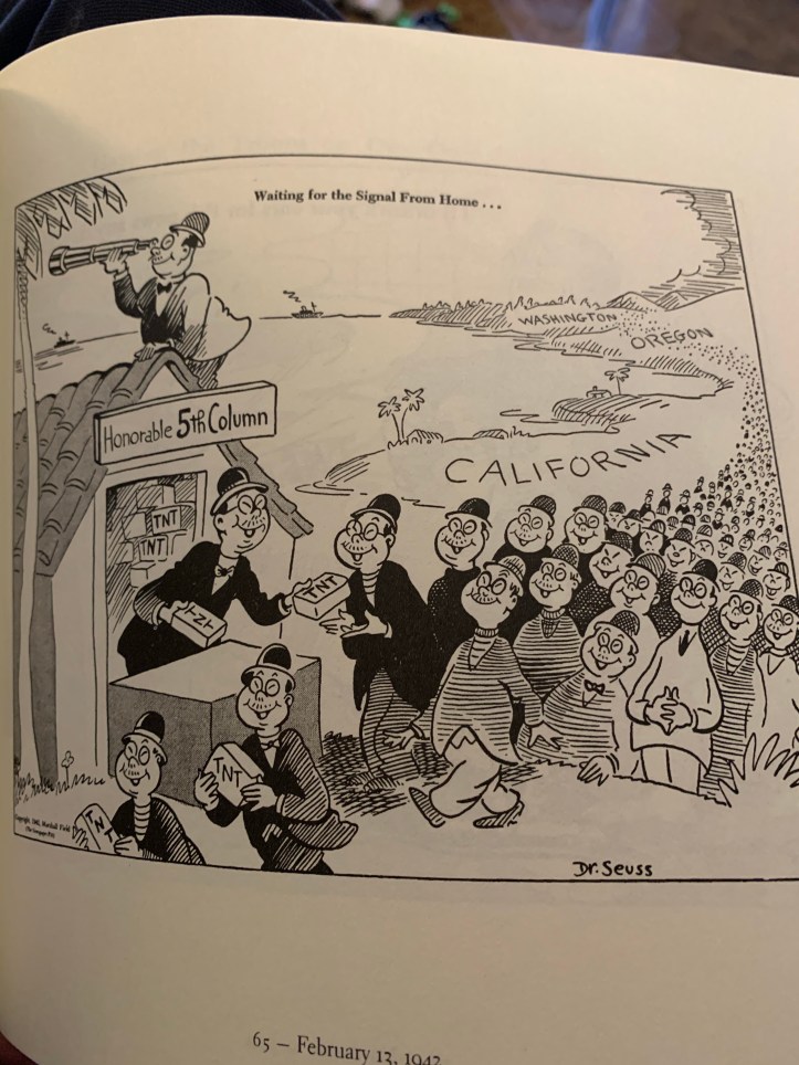 After reading the six pulled books I was curious to look into Dr Seuss’s adult works. Earlier I wrote my thoughts on The Seven Lady Godivas. This work shows much of Seuss’s editorial cartoons from the PM magazine leading up to the United States declaring war against Japan (and later Germany) and after the events of Pearl Harbor.