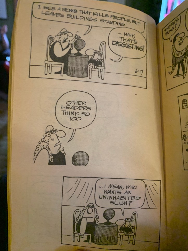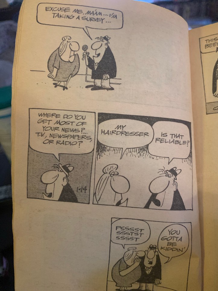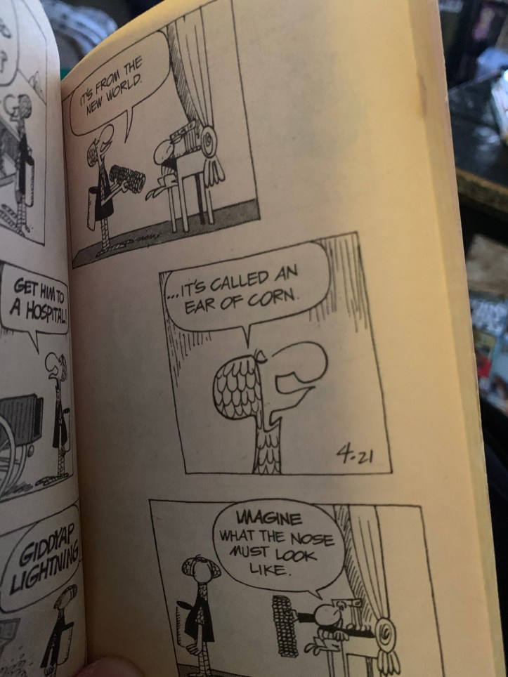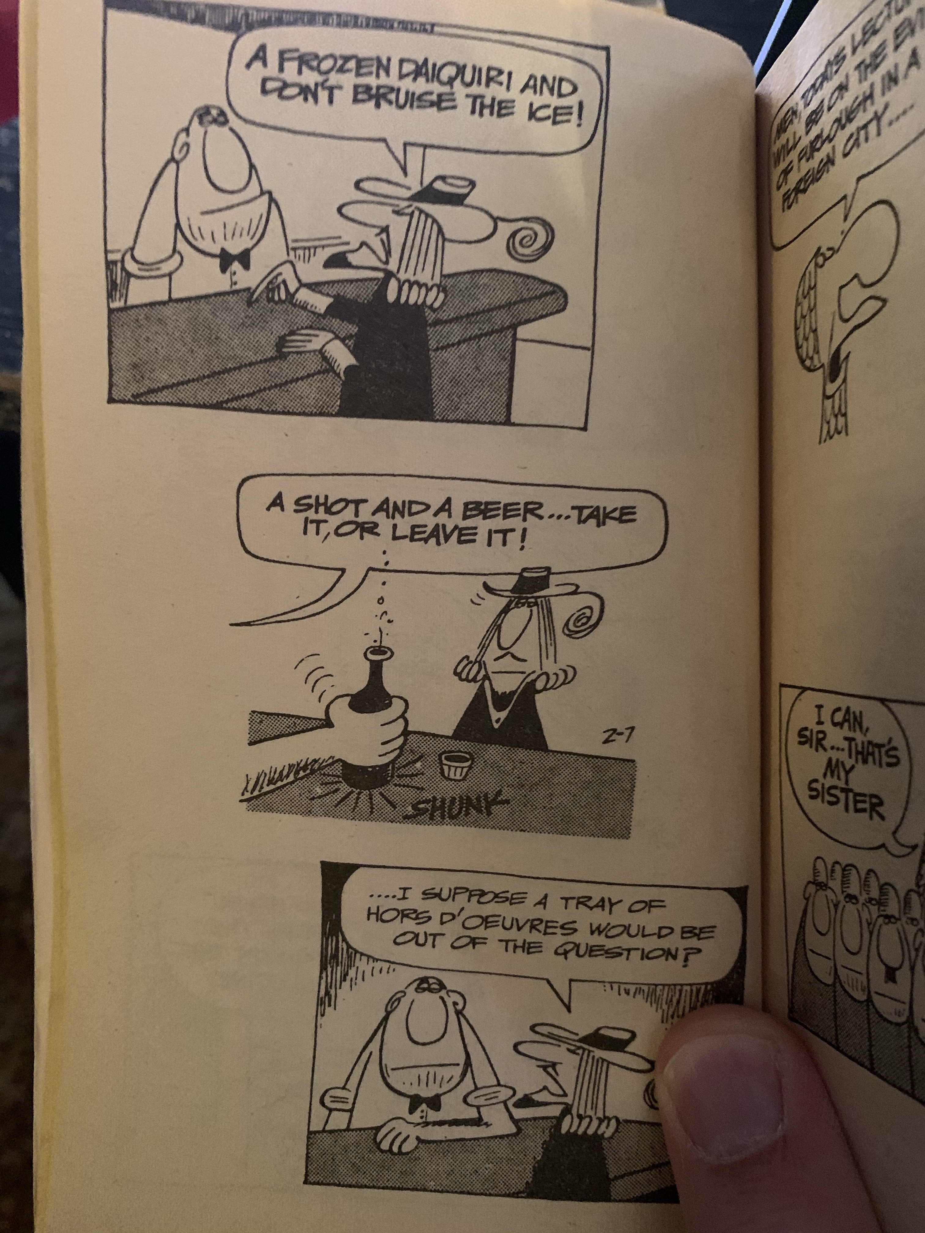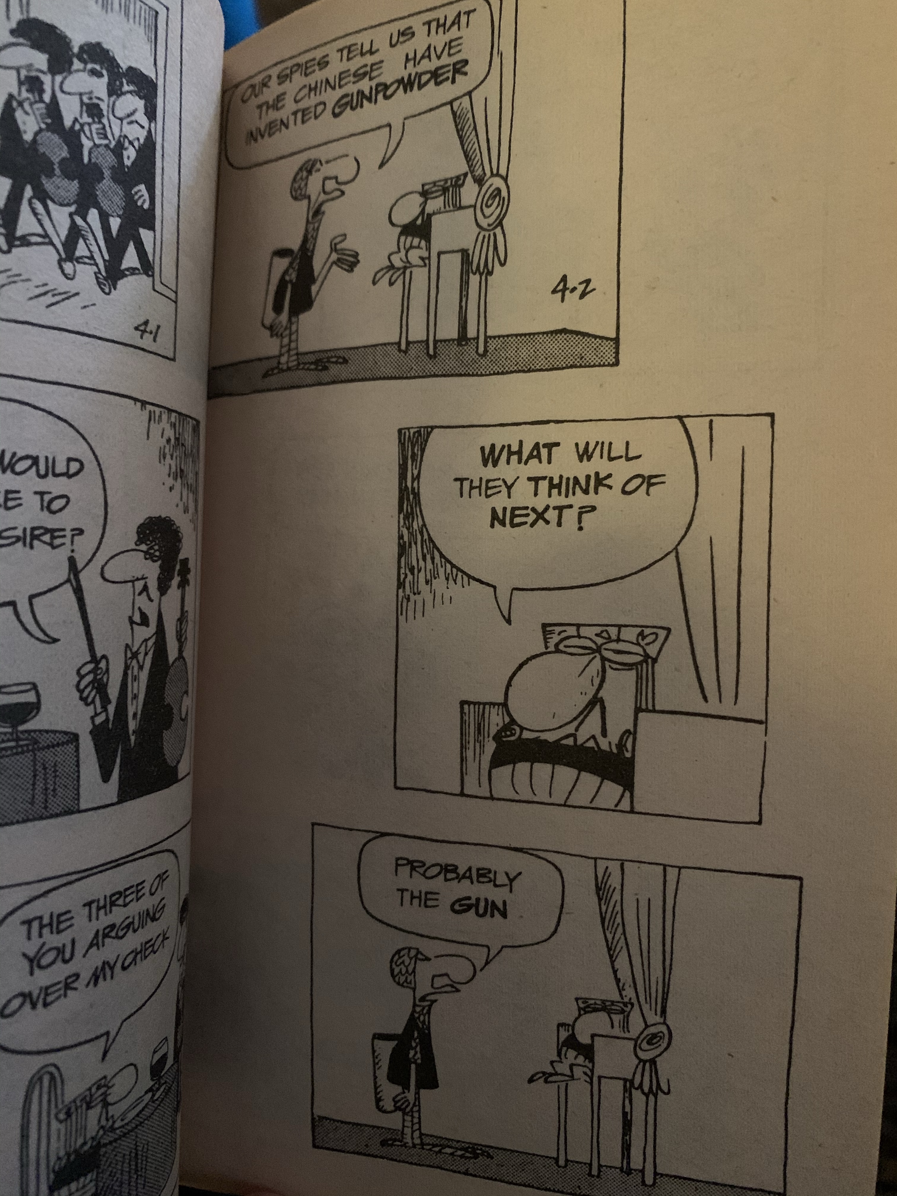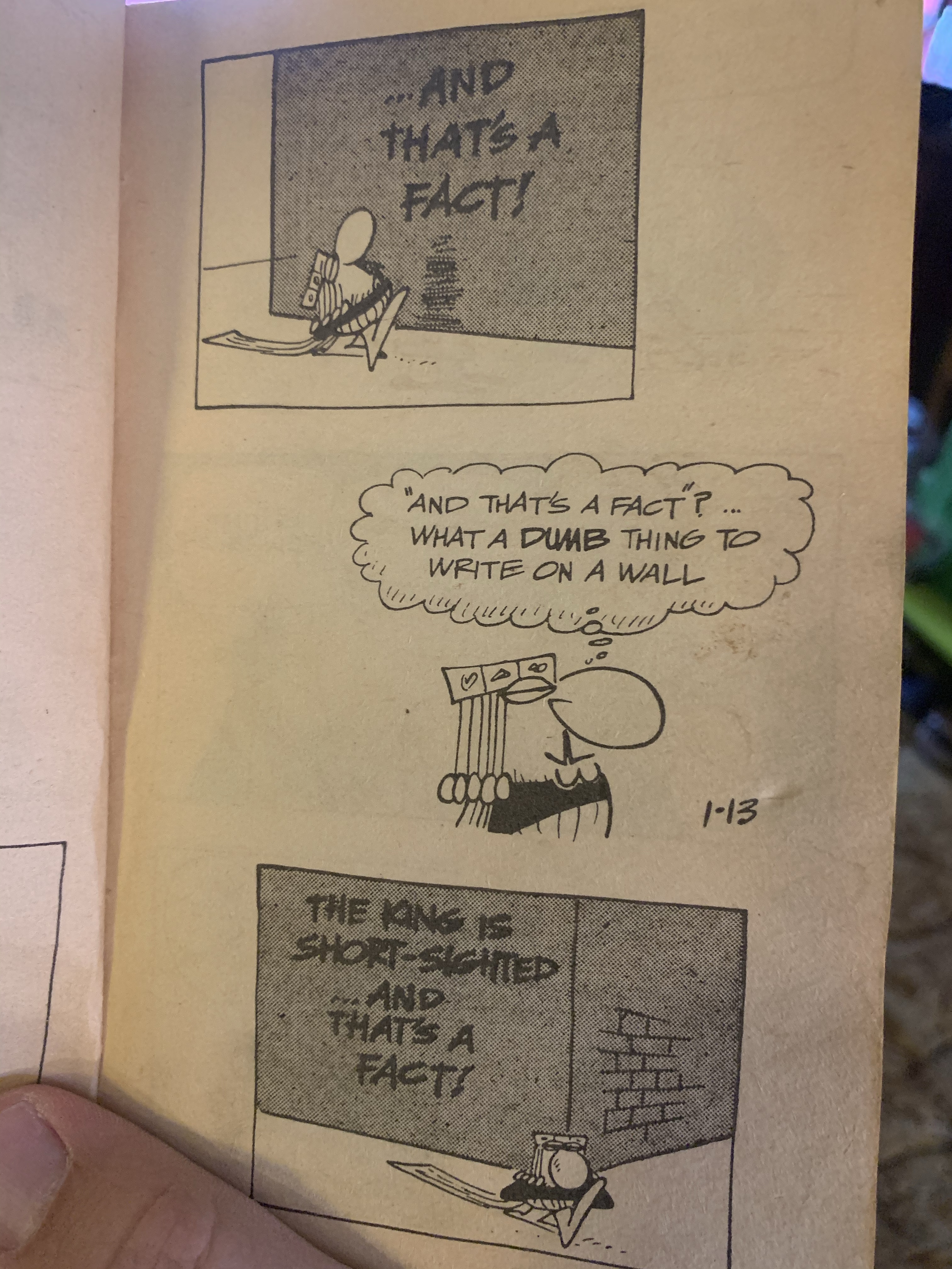 Really, it’s such an odd concept that isn’t really explored. The titlular Wizard is arguably the third focus on the strip, after the King (is a fink) and Sir Rodney. Nothing about this kingdom is really explored. The king raises taxes, they’re collected, the wizard plays in his lab, people get drunk. The king is short but that’s about the only distinguishing feature. A story of a country that’s not thrilled with their leader can be done anywhere anytime in history. Nothing about Wizard of Id, not even the wizard feels like a story that has any magic or uniqueness to it. Maybe this is a modern complaint. Cartoons alone taught me that there is no end to combinations of teenage crime slueths and a talking something that doesn’t usually talk.