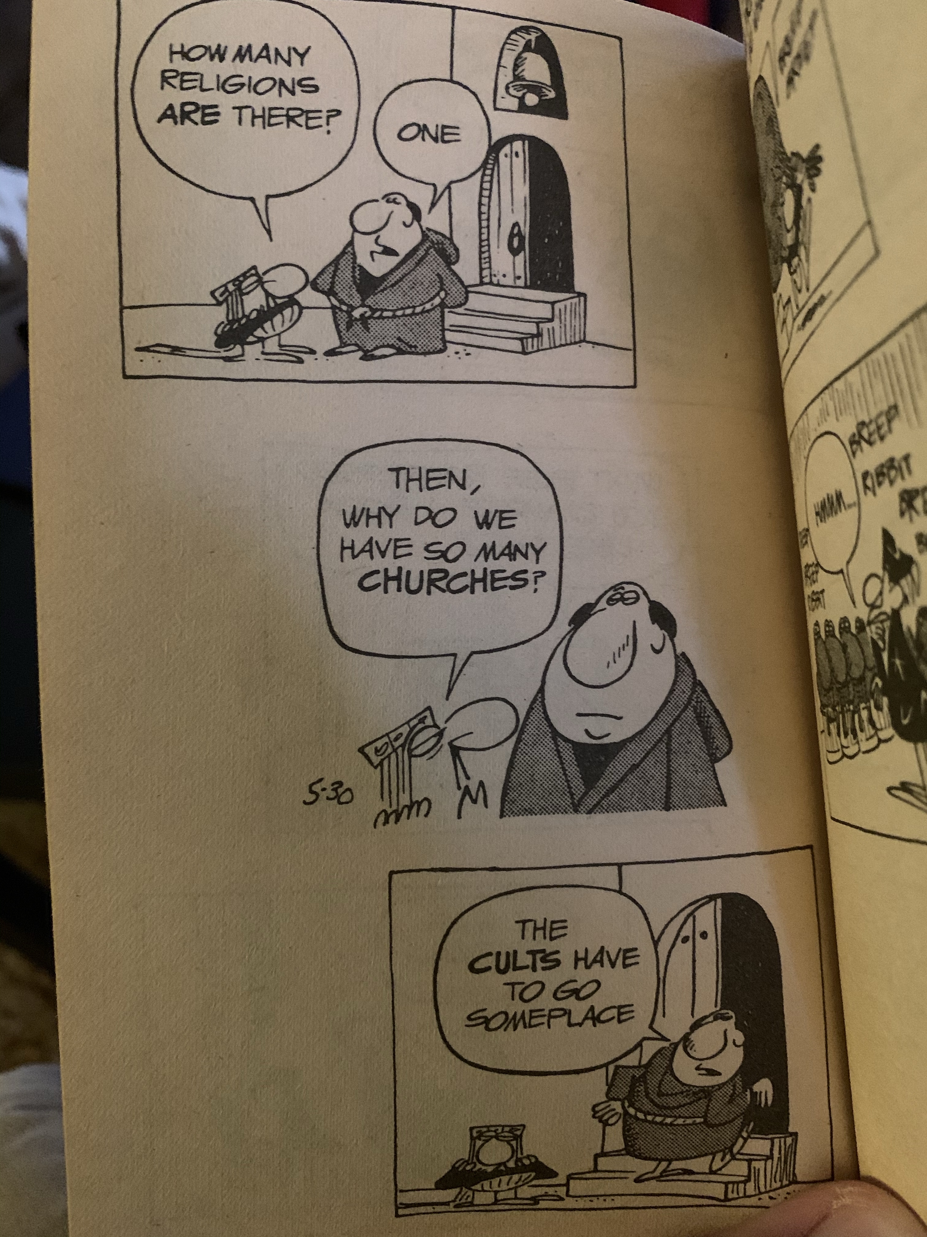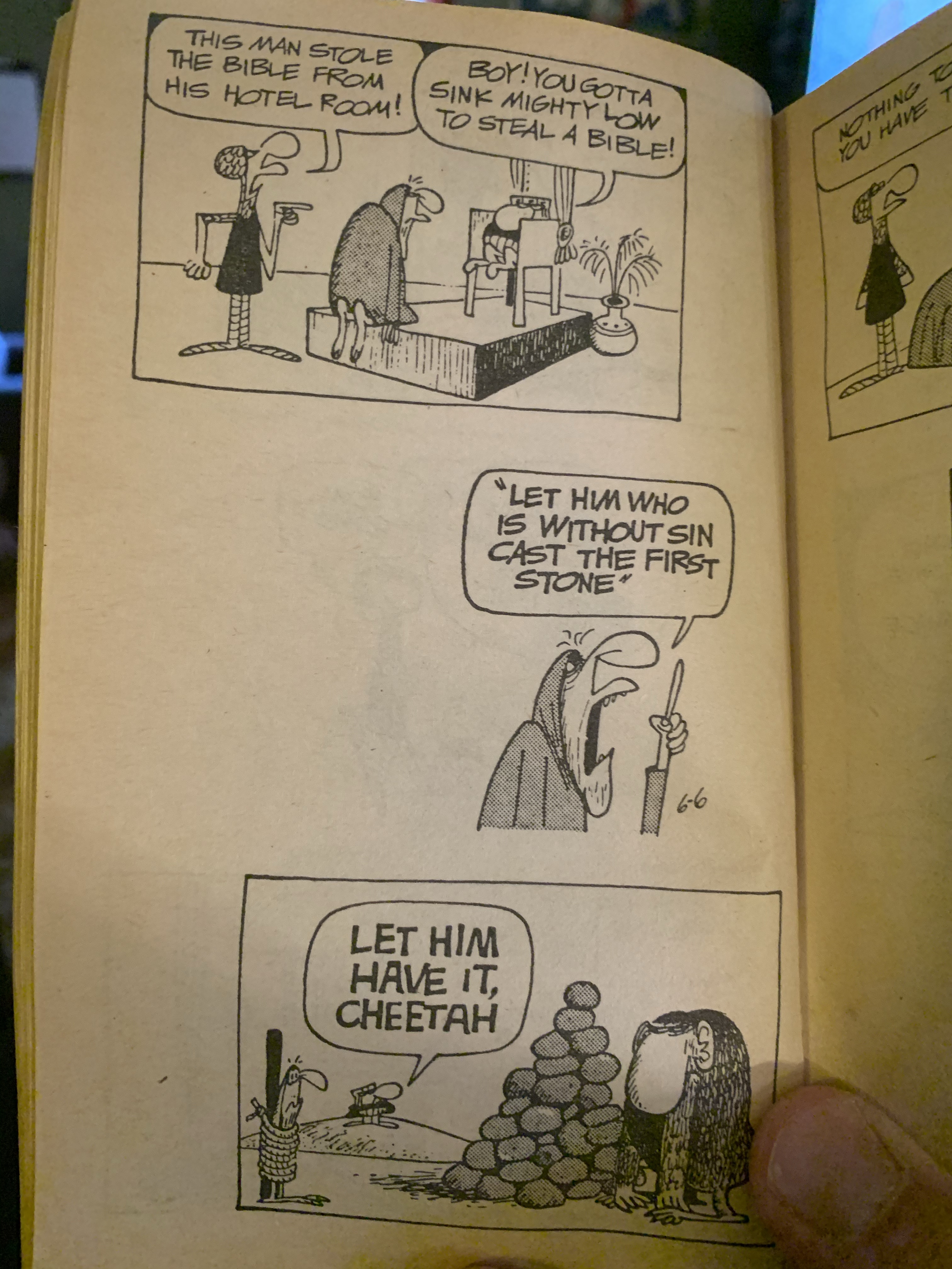 So we have a fat joke under the usual “let me complain about my wife” school of jokes. Some barely subtle racial jokes. I hesitate calling it racism, becasue it’s not from a place of hate. But it is racial. A good dumb joke about an ear of corn. Then some truths that are still true 40 plus years later, and probably true for hundreds of years. My religion is the one true religion, yours is a cult. Gossip is given more weight and validity than news. Leaders see what they want to see and manipulate what doesn’t agree with their agendas.