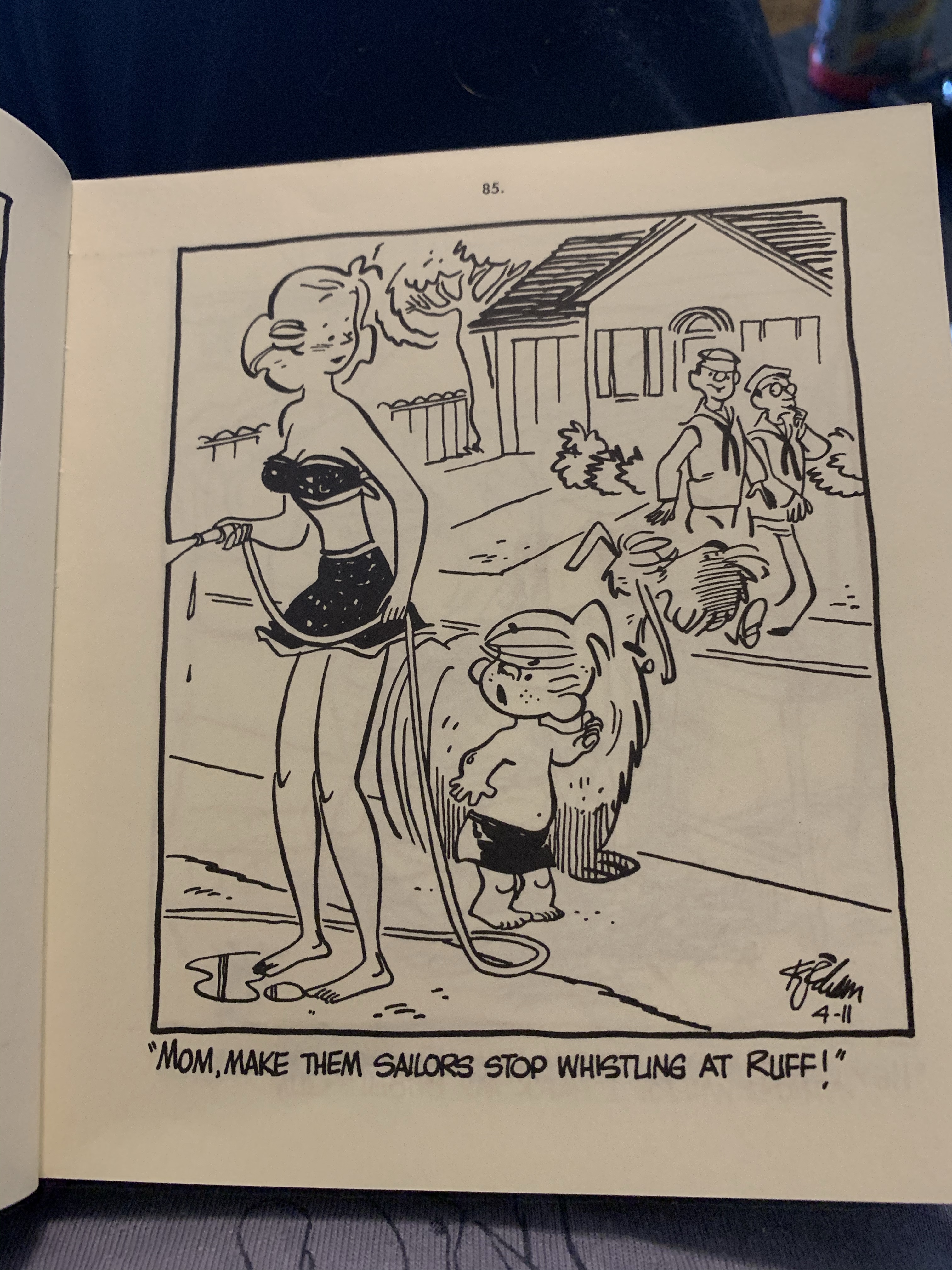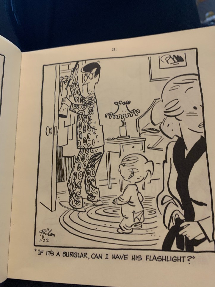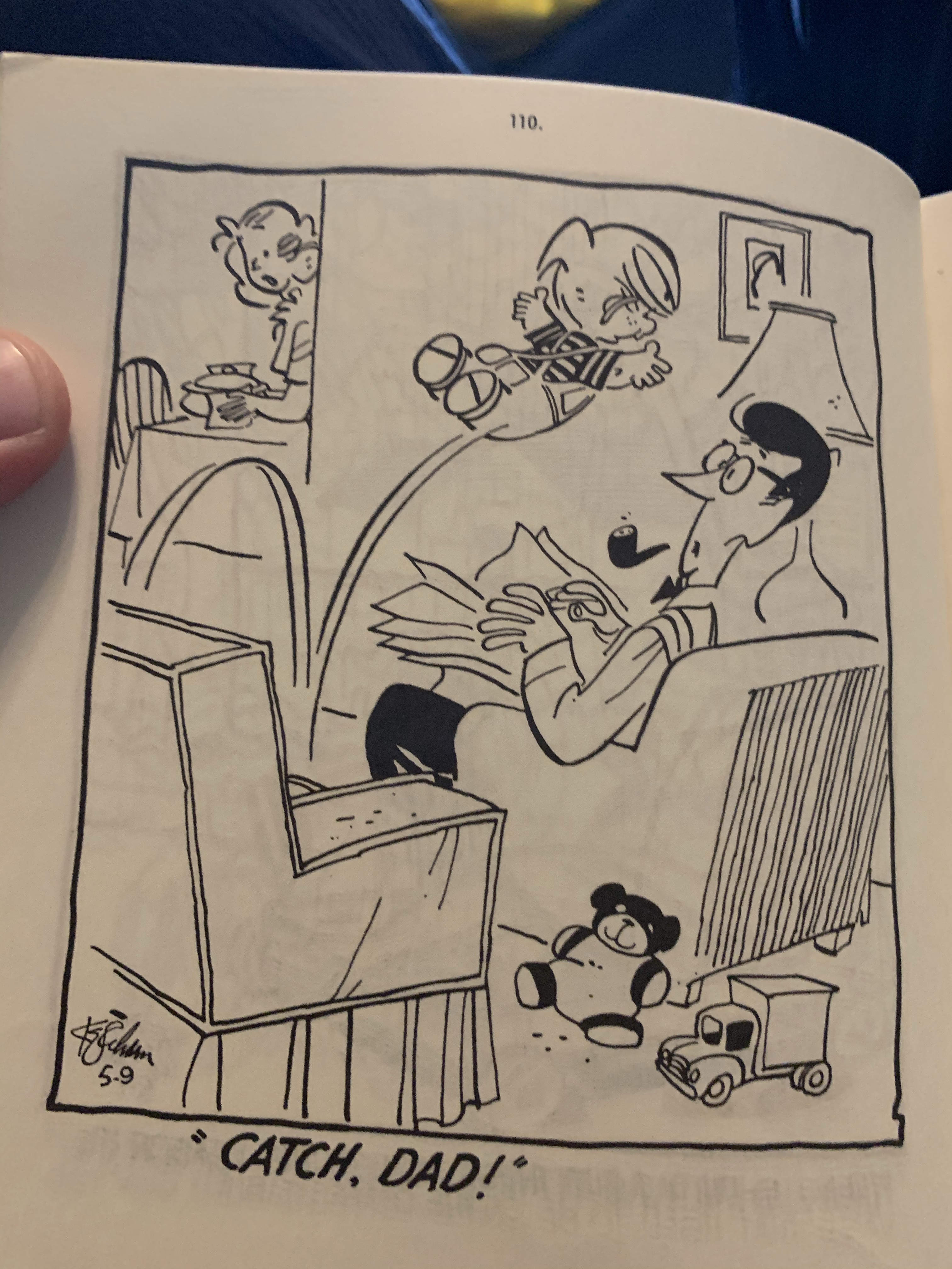I can see myself now in Dennis’s parents. Parents who love their child even when he’s a monster. Parents who still love each other but will never ever have another child because what if that kid is just like this one. Parents who need time to be by themselves, to remember who they were when not an extension of a child, so he is your child for the next hour and then the door closes. The best comic strips, the best stories really, are ones that resonate with everyone and these Dennis strips are relatable to every kid and every parent.