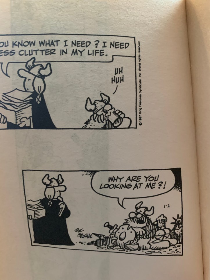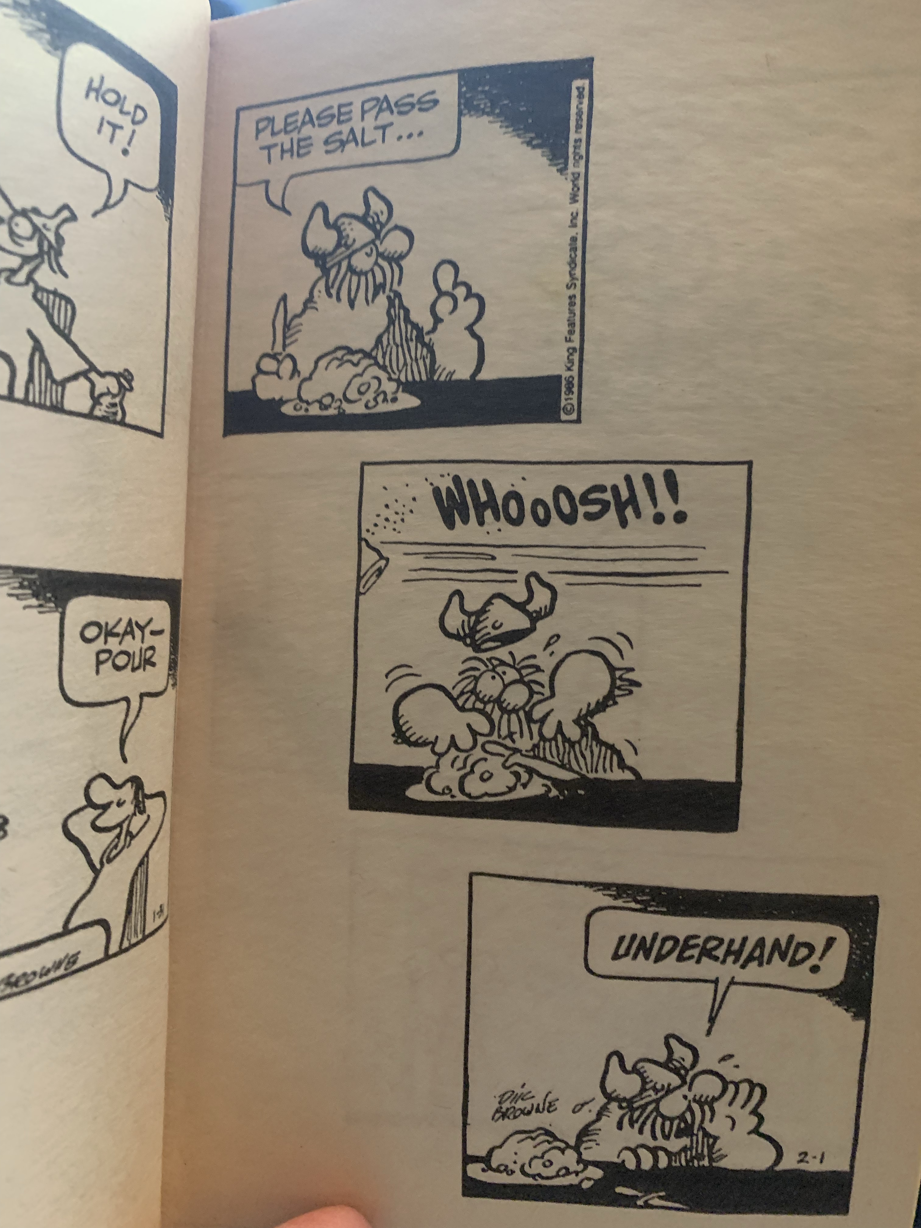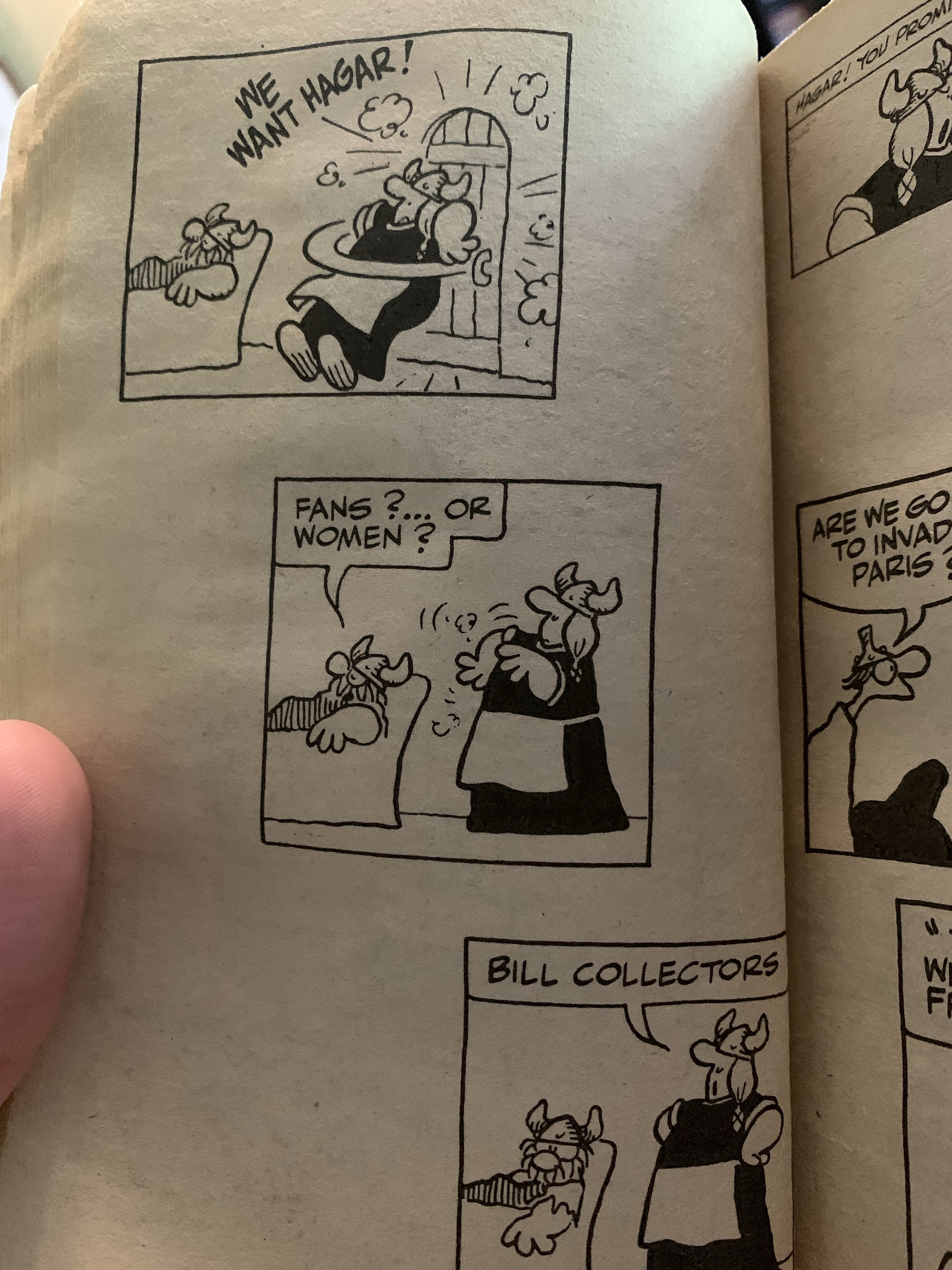 Until I read the Sunday collections. These are amazing! Hear No Evil (Do No Work), Room for One More, and Pillage Idiot are collections of only Sunday strips. The extended format of Sunday strips allow for a bigger exploration of Hagar’s world. The Norse world. And a loose time frame too. Battle the English, hang out with Attila the Hun, what’s this new thing called Christianity? The battles are bigger. The journeys are longer. On Sundays Hagar is no longer a three panel quick set up and the punchline. Sundays are for adventure. Sundays are full of potential. On Sunday Hagar becomes the Phantom, a hero of the funny pages. While so many publishers are looking for modern takes on characters, I have my pitch right here for Hagar by way of Conan. To hear the lamentations and the giggles of women.