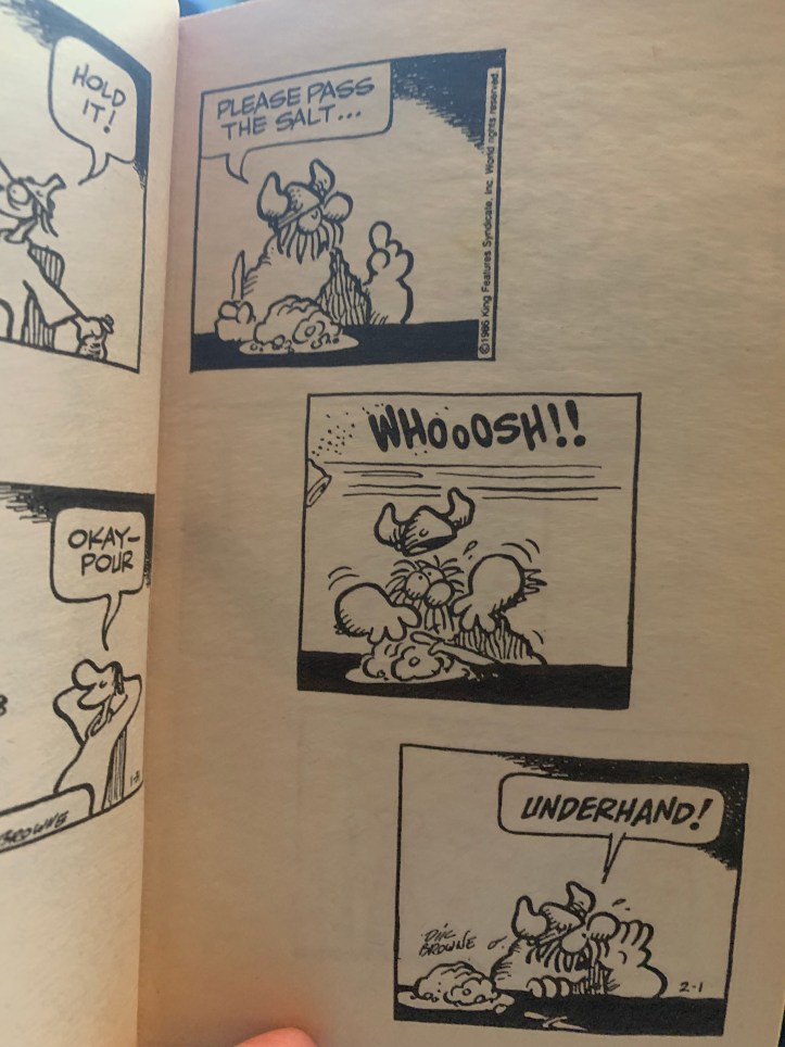 Timeless and universal, but also kind of tired. He loves his wife but she’s always making him do stuff. His best friend is a moron. His kids are great but a pain at times. Why is there always an annoying pet at my feet? It works now, it works in the 80’s television I grew up on, the 50’s and 60’s TV our parents watched, the original comic strips showing the modern day of 1930’s America, the Stone Age, the Space Age, and even Nordic times. Still enjoyable, and there were some great ones in here. But in my older years I’m more drawn to strips – new or classic – that are telling jokes and stories only they can tell. For Better or For Worse, Pearls Before Swine, and others have a distinct voice. I want a gag that only works within one strip. There’s not much difference between Dagwood eating a sandwich and Hagar eating a drumstick.
