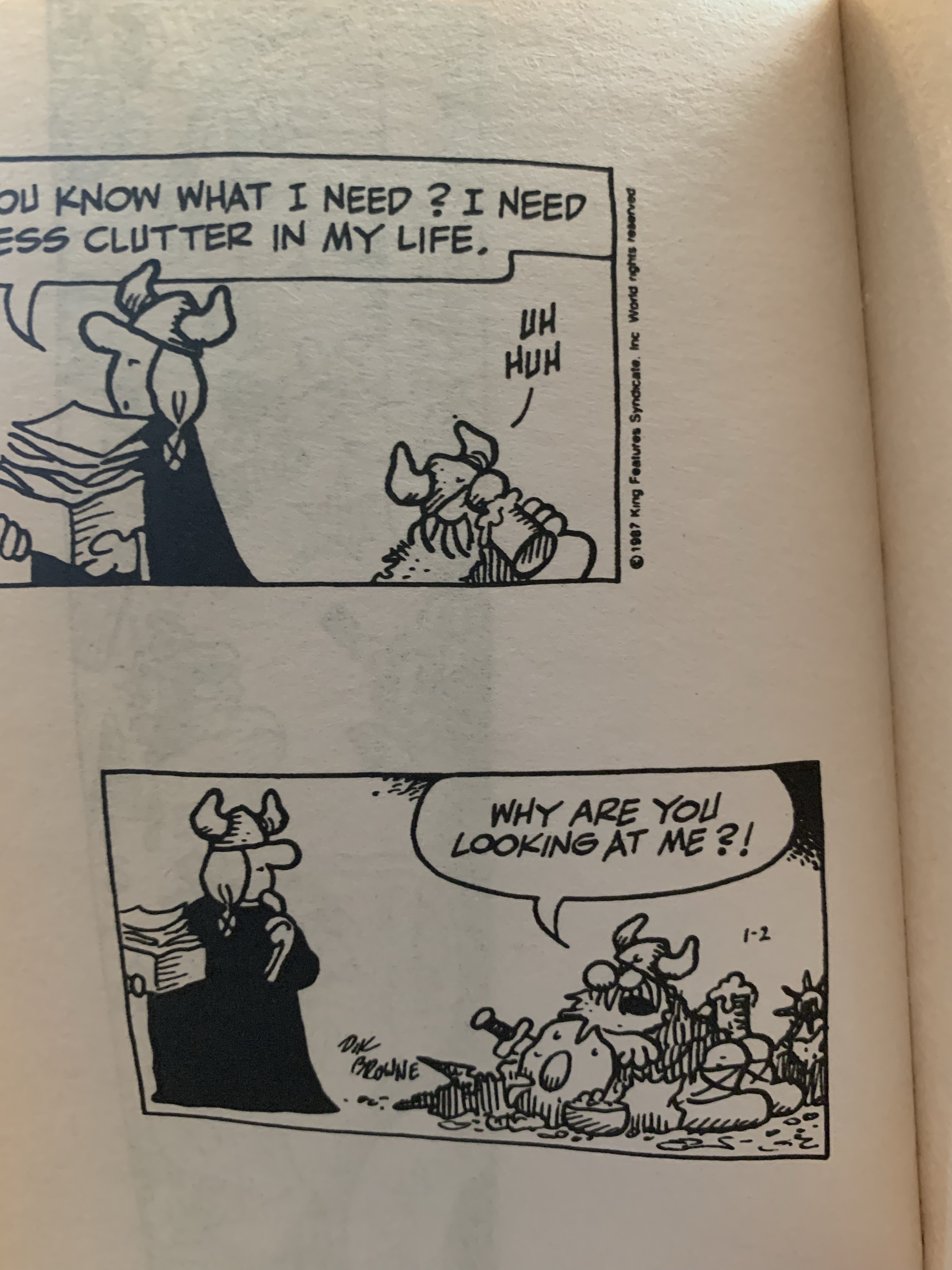Hagar is a simple Viking. He wants to pillage, bring his haul home, have a couple drinks and dinner, then relax at home. Many sitcoms were built around the head of the household going to work, meeting his friends at the bar, going home, and then we all laugh at what happens along the way. Putting this classic trope into a Norse package shows the timelessness of the rat race lifestyle. Speaking of, I had to send this one to my wife:
