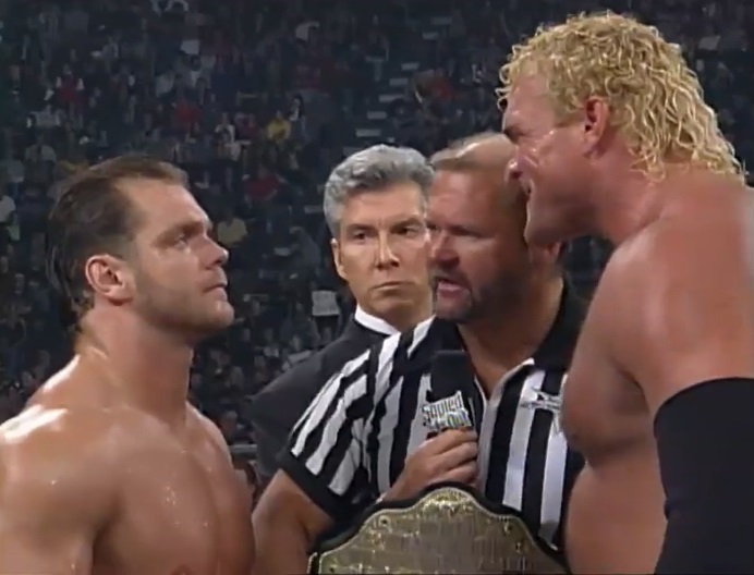 Benoit celebrates. No mention is made of Sid’s foot under the ropes but I do remember WCW taking advantage of this the next night on Nitro. I wonder if it was a good accident or set up just in case.