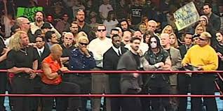 We are live from Denver and all the fireworks start off this explosive episode. All of the younger, non former world champions are in the ring. More come out as the episode opens. Vince Russo has called this meeting. A lot of faces we haven’t seen in awhile, or at all. No one in the ring is in their wrestling gear. Jeff Jarrett comes out to introduce Vince Russo. Russo’s “Iron Man” music hits. He said he’ll never appear on camera! Oh, if only. Between Jarrett and Russo WWF or related names are said at near a 5-1 ratio over WCW. Way to start fresh putting over your own company. We have our first mention of the “New Blood of WCW”. I feel bad for the people on the opposite side of the ring that are staring at dozens of butts for 20 minutes plus. The Good ole boys network. The Radicalz. Why don’t I switch channels? Hail and – Rick Fuller? Looking very tall in the back. Eric Bischoff says “are you done yet?” We expect fighting but Vince and Eric hug. They list their mistakes like Hall, Nash, Sting, DDP, Sid, and the biggest of all – Hogan. Lex, Liz, DDP, Kim, Sid, and Sting all watch in the back. People who were against each other just two weeks ago. Eric apologizes to everyone in the ring – the New Blood. Brian Knobbs just smiling and nodding along as his best friend/meal ticket is run through the mud.